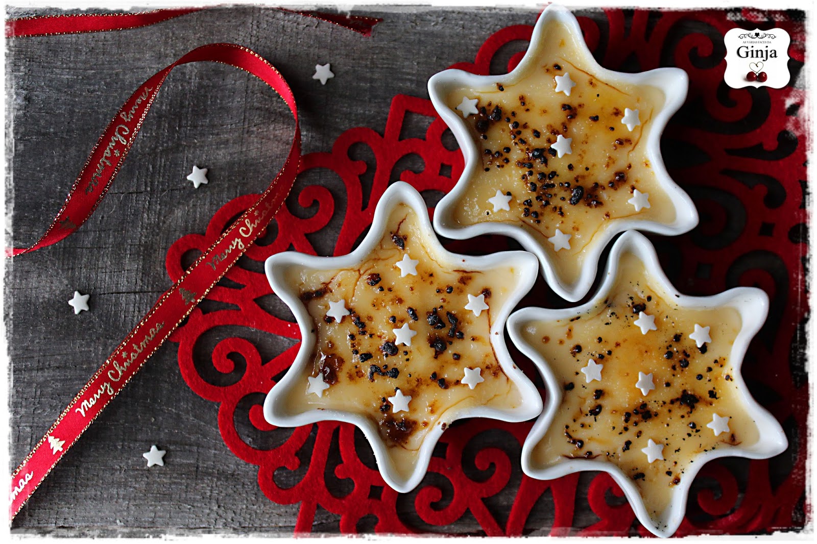 Com massa folhada, forrar as forminhas para tarte, recortar a restante massa com o rolo, para fazer a "rede" ou com os cortantes em forma de estrela de vários tamanhos e reservar;